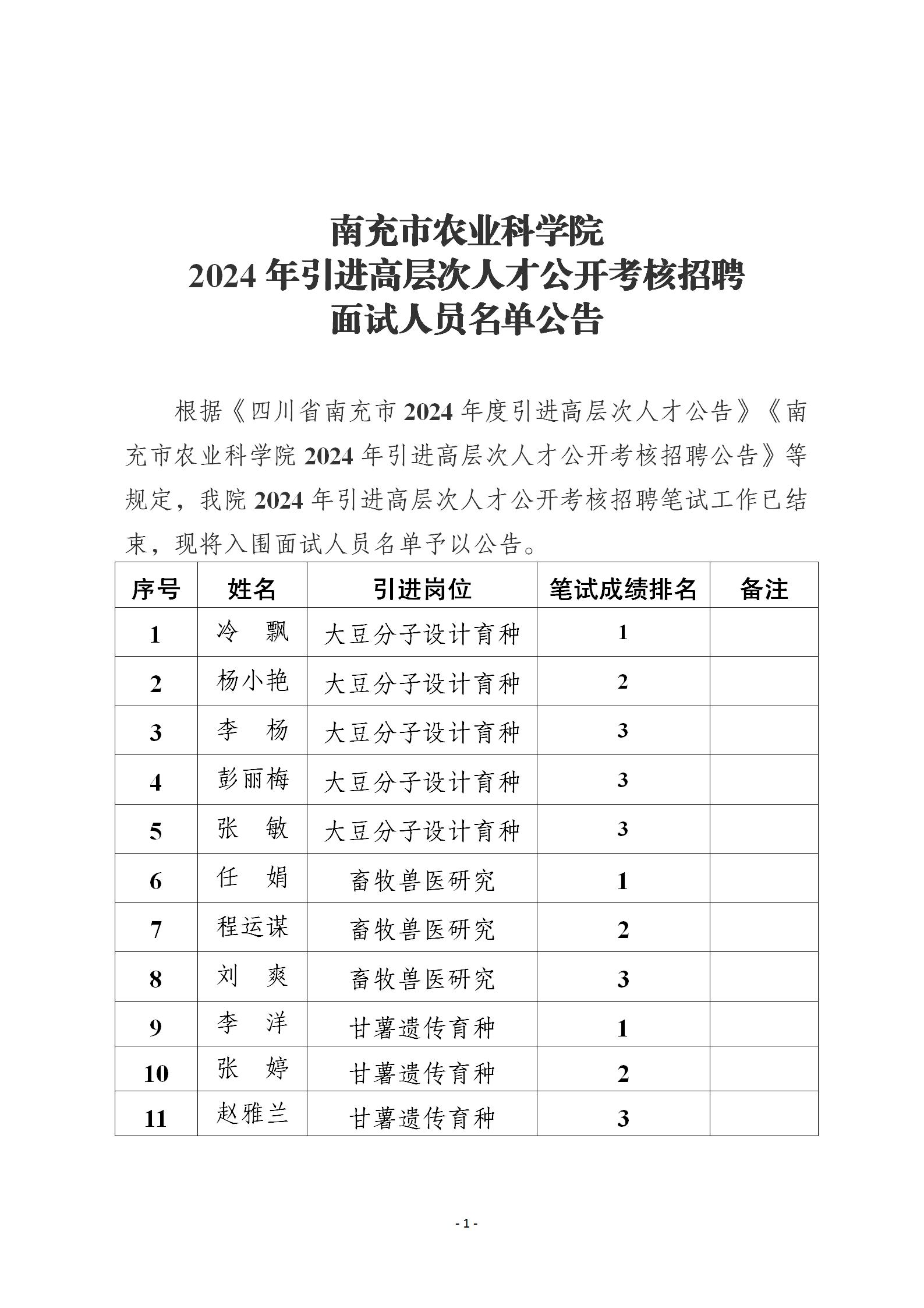 南充市农业科学院2024年引进高层次人才公开考核招聘 面试人员名单公告