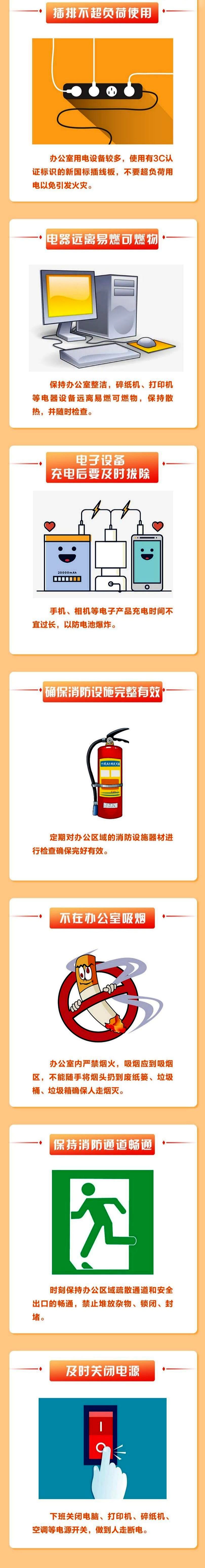 用电安全:电脑、空调等设备避免长时间待机,下班前关电源,做到“人走电断”;不私拉乱接电线,插排选3C认证产品,严禁超负荷用电。
